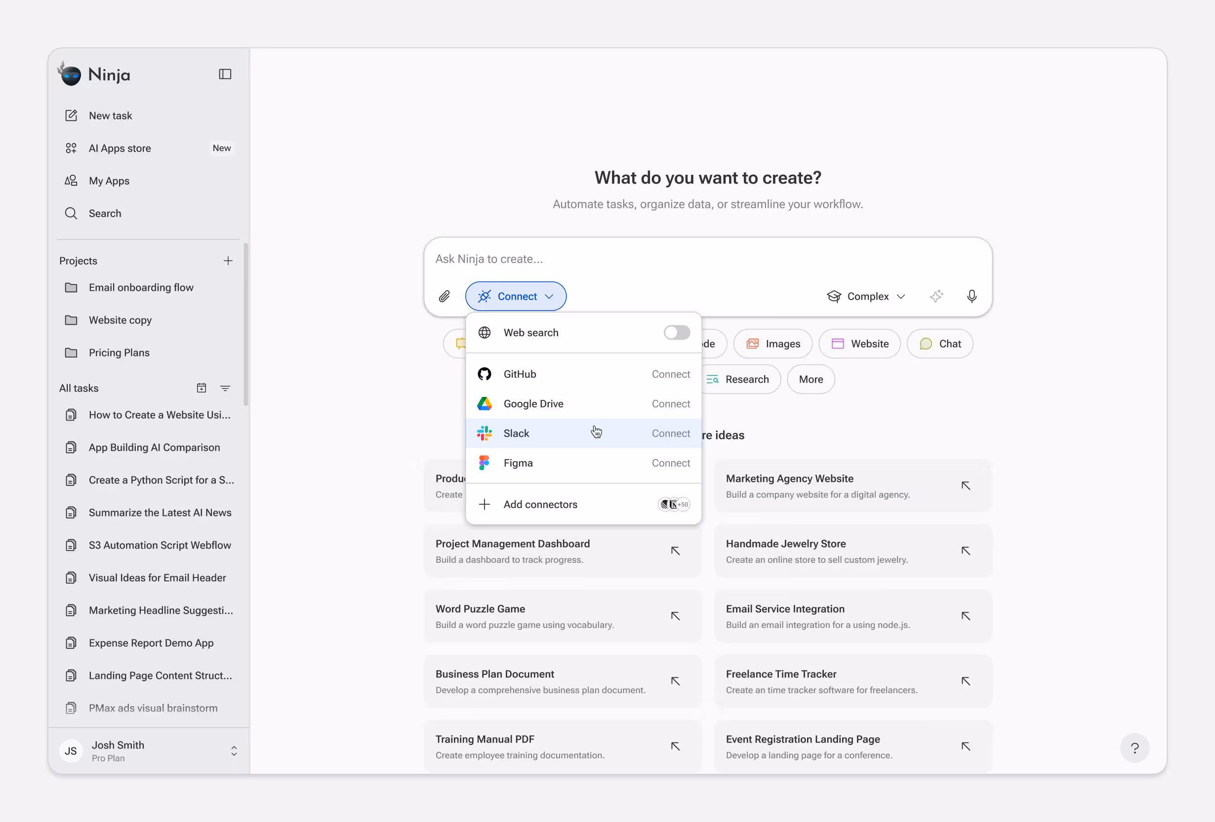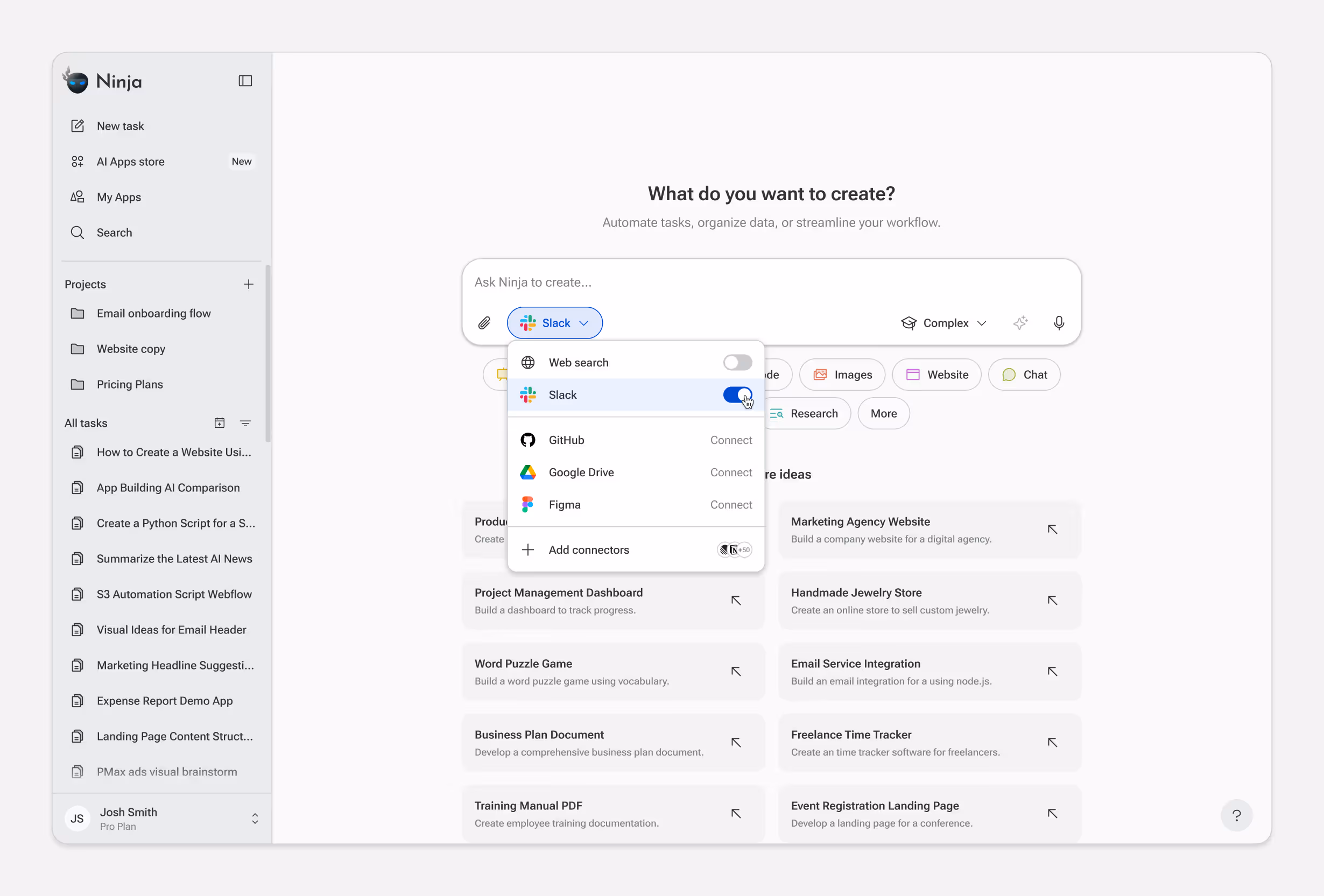 SuperNinja connects to external tools and data sources through MCP, GitHub, Slack, Google Drive, Notion, and more. Once connected, the agent can pull live data into tasks automatically.