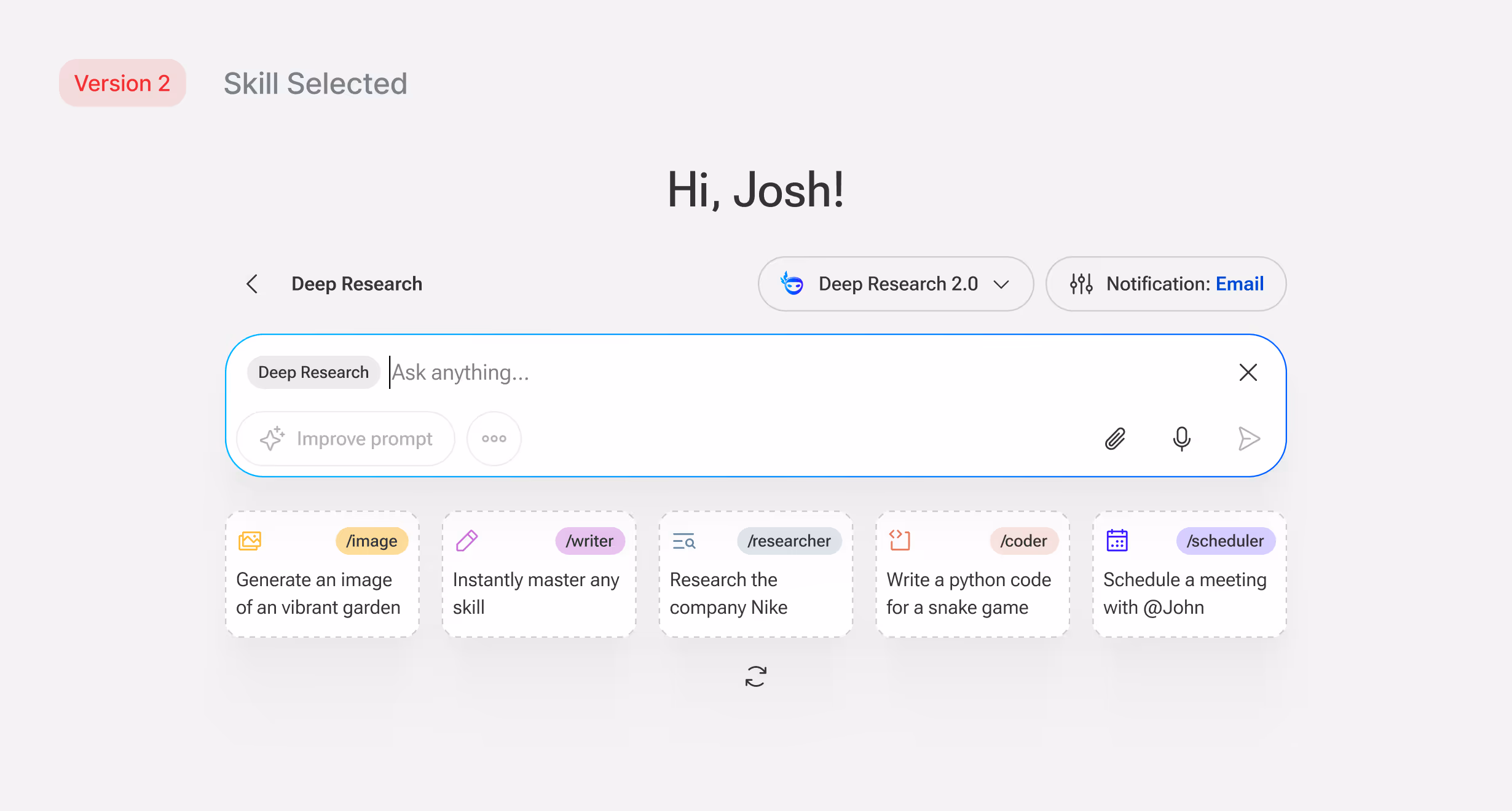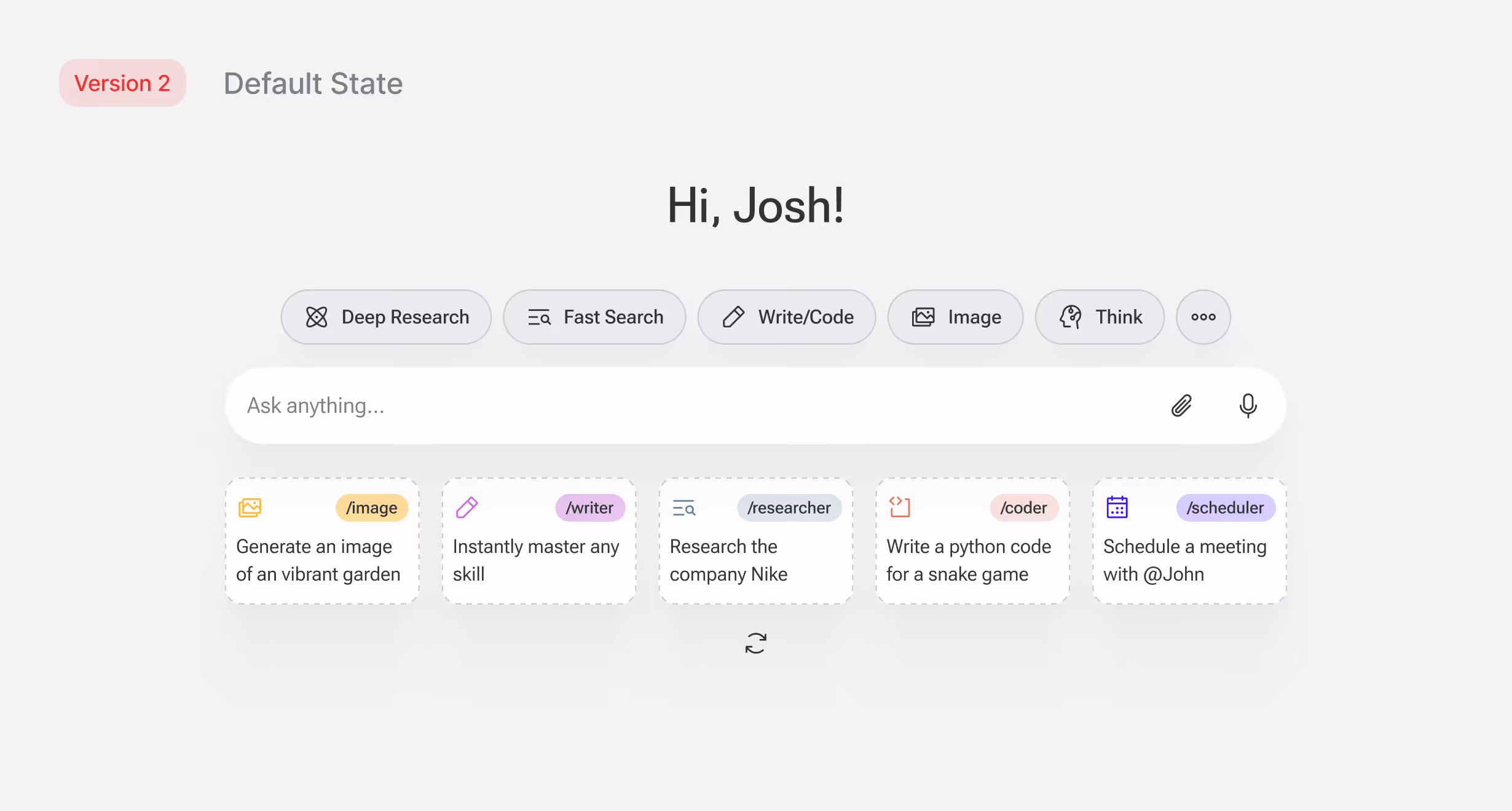 Early versions tried to solve this inside the input: a "/" command system, a Prompt Library button, utility features competing for attention and didn't scale well between screen sizes. Below the input was a row of example prompts but looking at usage data showed almost no one tried them.